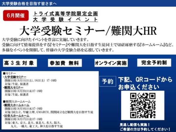 大学進学を検討している生徒さん、またはトライへ転校をご検討の方、是非上記URLから大学受験セミナーに参加してみてください。