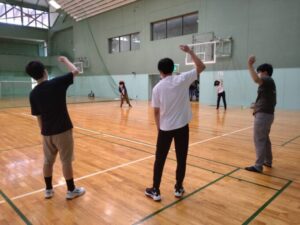 まず、ラジオ体操をしました。運動をする前に体をよく伸ばすこと大事ですね。