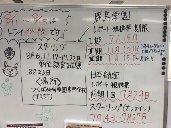 以上、まだもうちょっと先ですが、トライ式高等学院つくばキャンパスから、お盆の休校期間とスクーリング日程についてお知らせでした。
