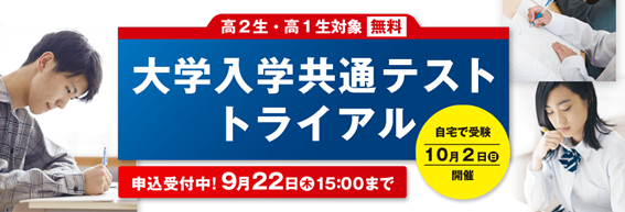 「大学入学共通テスト トライアル」は、大学入学共通テストの出題傾向を分析して作成したオリジナル問題。1教科からでも受験できますので意欲のある高1生や中学生の方もチャレンジしてください。
