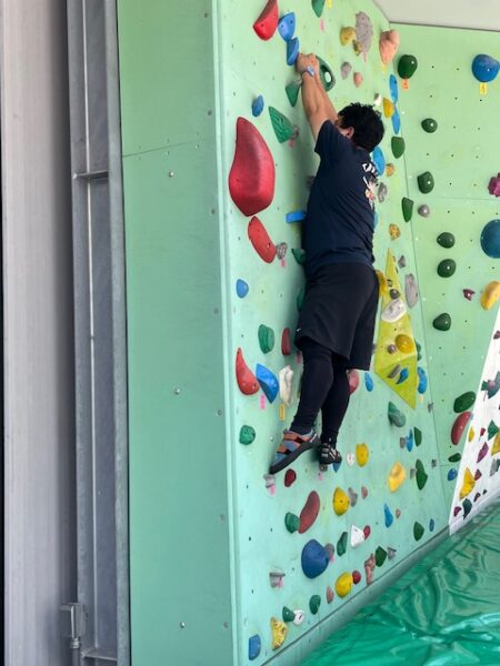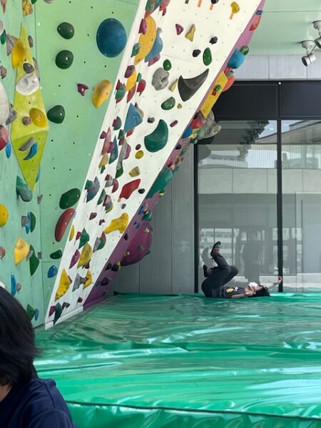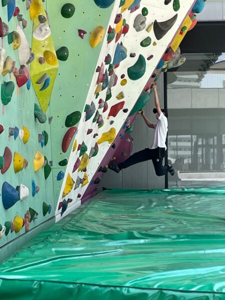 ボルダリングは好きな石を自由につかみながら登るのではなくて、同じ色の石だけを使って登るというルールがあり、思っていたよりも難しかったです。