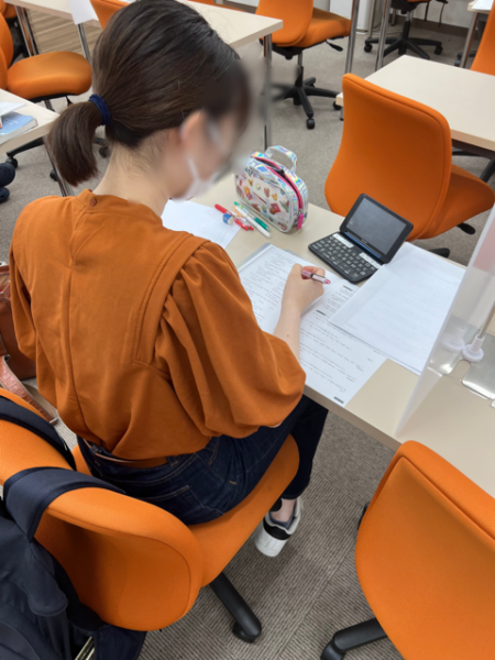 個別ブースの端で勉強する生徒Kさんは、12時に登校し、今日は夜の19時まで勉強するとのこと。