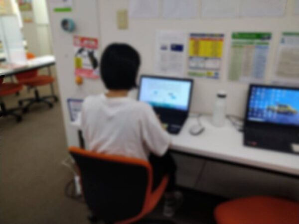 ノートパソコンと格闘しているSさんは、関東圏の大学・総合型選抜入試に向けて、自己PR資料の作成中。朝一番からの授業も頑張った後、PCに向かっています。