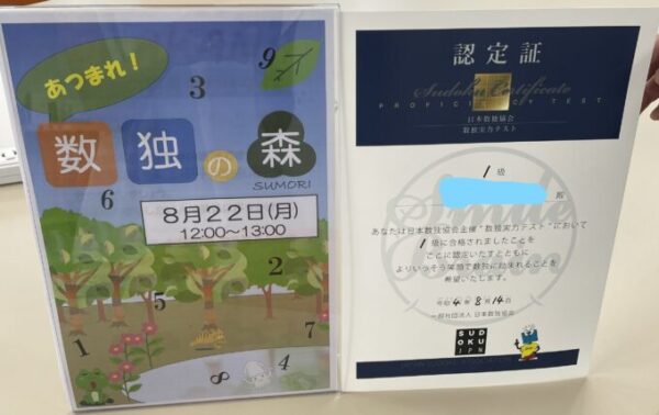 数独には実力テストがあるのをご存じですか?日本数独協会がテストを実施しており、解いた問題によって定めた級位を認定しています。受験者の全員にそれぞれの級位の認定証を発行しており、今回はその数独テストの最上位である1級をYちゃんが取得しました✨