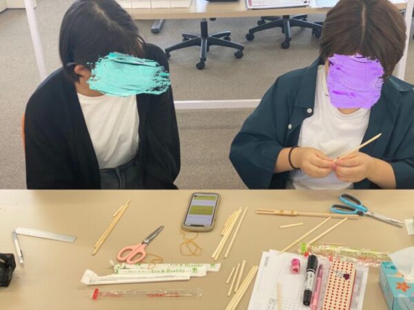 こちらでは射的の準備中♩割りばしと輪ゴムを駆使して鉄砲をつくります!