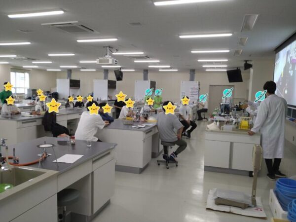 みんなで岡山理科大学のキャンパスに実際にお邪魔して、本格的な科学実験をしてもらいました。