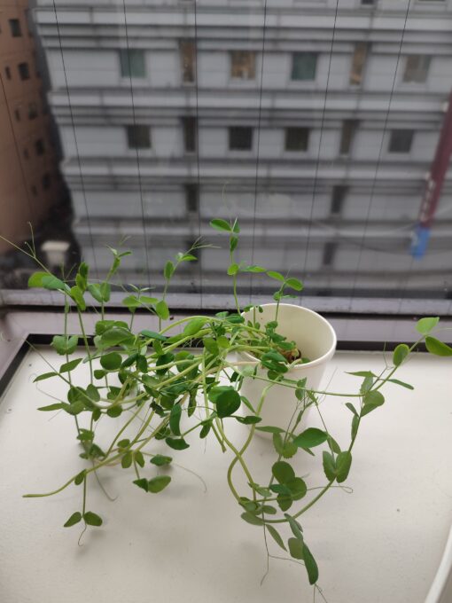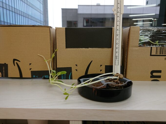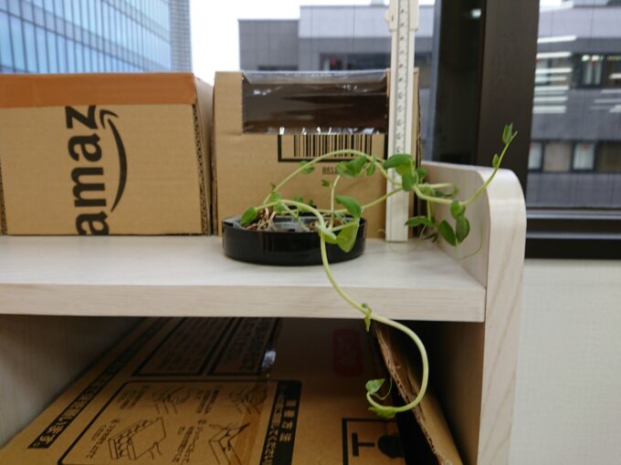 明治通り沿いの窓際で豆苗(とうみょう)の観察を開始し、