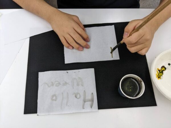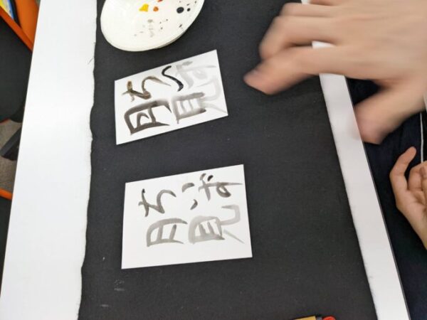 ということで、今回の書道イベントは茶墨という種類の墨を用い、水多めの墨汁と絵具で絵を描くように字を表現していきました。墨汁は黒一色ではなく、水を多く含ませることで様々な表情を見せてくれます。