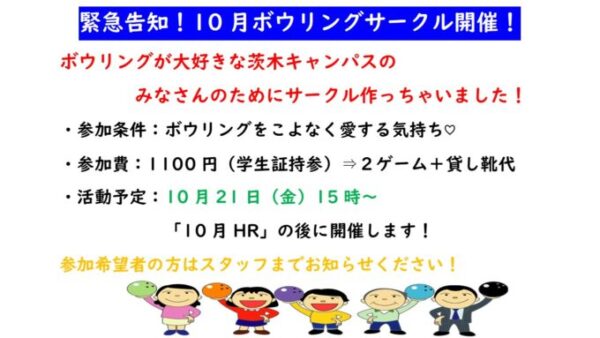 10月HR&ボウリングサークルのご案内になります(❁´◡`❁)
