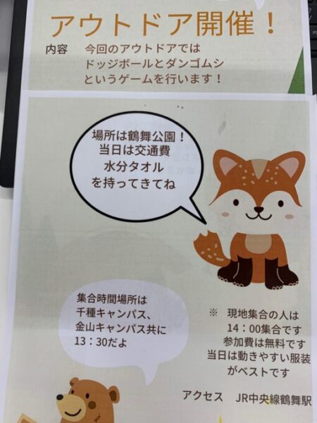 久しぶりにアウトドアサークルが活動を再開します。