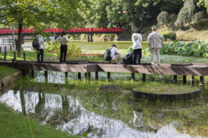 生徒たちは公園を散策して、iPhoneや一眼レフを使って、
