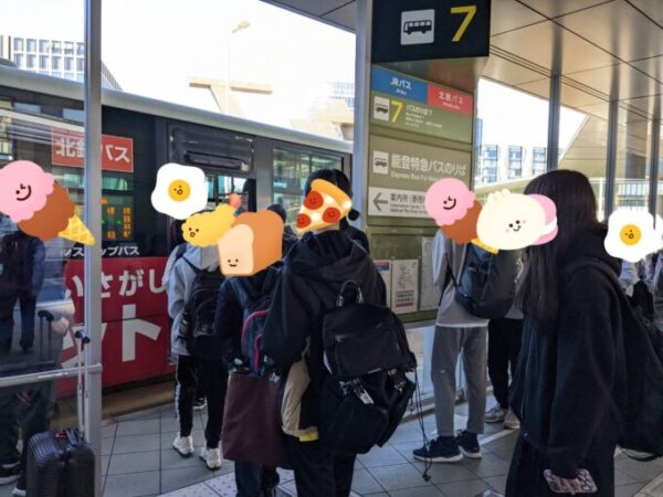 朝、続々と金沢駅に集結しみんなでバスに乗って移動しました。
