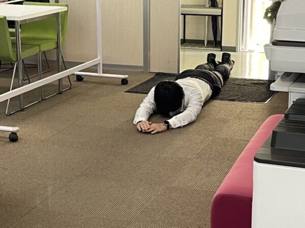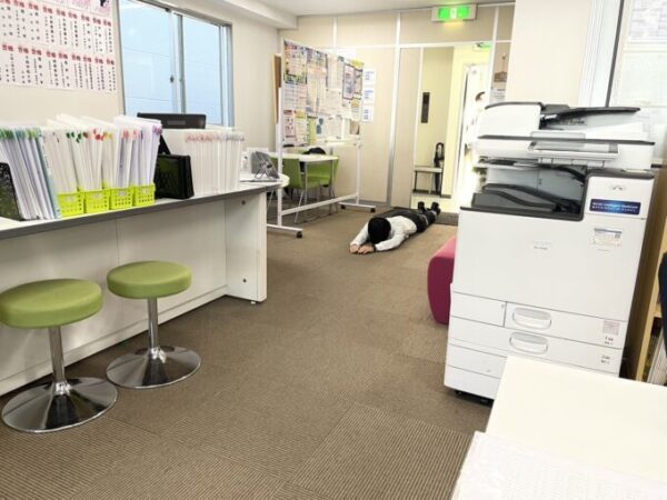 キャンパスの入り口で倒れているのは…なんとキャンパス長の大川さん!!