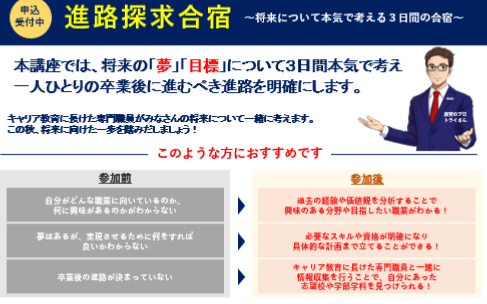 先日、トライ式高等学院の進路探求合宿があり、甲府キャンパスから4人の生徒さんが参加しました。