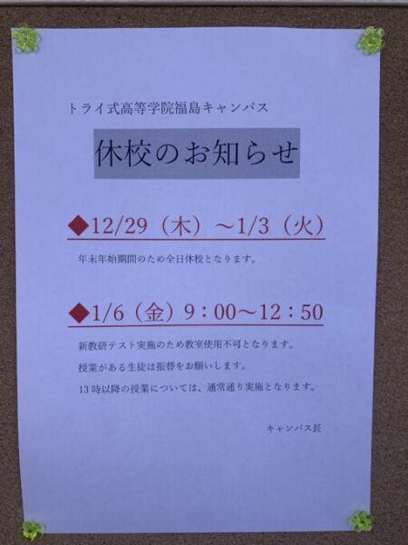 そんな福島キャンパスより年末年始の休業についてお知らせです!