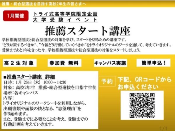 1月26日に「新高校3年生向け 推薦スタート講座」が実施されます!受験希望かどうかにかかわらず参加しましょう😊申し込みは本日(1/24)の22時までになります!この後に続く推薦入試合宿に向けて、みんなで良いスタートを切りましょう🎊✨