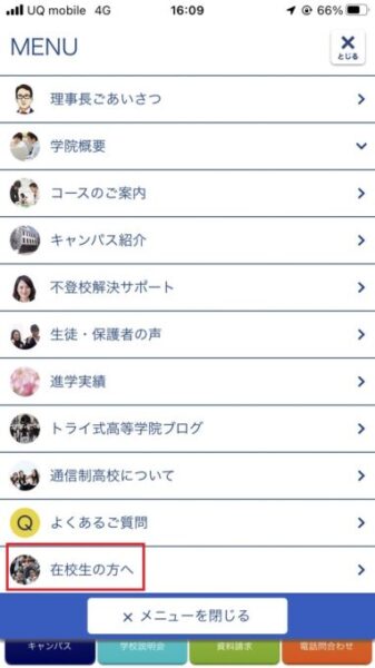右上のメニューをタップすると、下記の画面が出てくるので、「在校生の方へ」をタップします。
