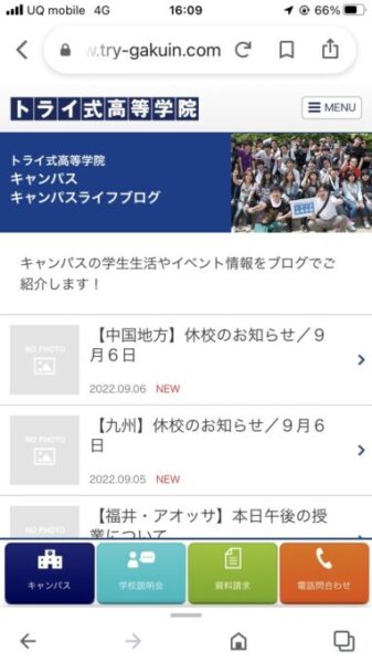 台風が来た時などは、トライ式高等学院の「オフィシャルブログ(公式ブログ)」に休校情報がアップされます。