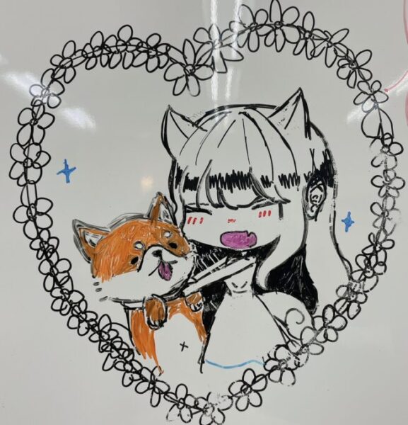 新メンバーのDさんはとってもイラストが上手!!作品は圧巻😲色使いがとにかく素晴らしいんです!!このブログではすべてをお見せできないのが残念ですが、、岸和田キャンパスの連絡用ホワイトボードをかわいくしてくれました!!ボードを眺めてわんちゃんに癒されています💛