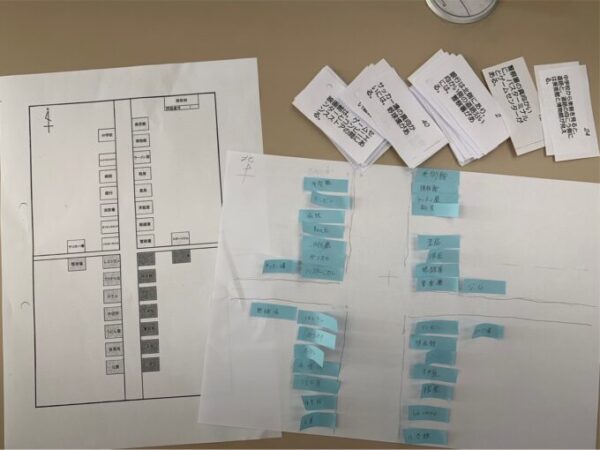 二チームともまずは施設を付箋に記入するところから始めていました。男女混合チームはまず、被ってもいいから自分のカードに書いてある施設をそれぞれが付箋に書いていました。男子チームは代表者の一人が全員から施設名を聞いて書き出していました。両チームとも最初は「カード多すぎ~💦」「出来る気がしない~💦」と嘆いていましたが、いざ始めてみると、「はい!はい!重要そうなことが書いてあるカード持ってる!」と自ら発言したり、「誰か、○○の情報が書いてあるカードもってない!?」と促したり、積極的に参加する姿が印象的でした!