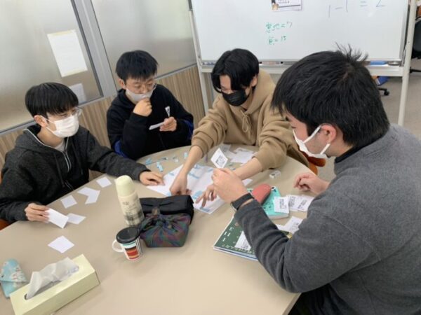 最近ゲーム続きだったので、今回は久しぶりにグループワーク『情報整理ゲーム』を行いました!少し時間がかかるかなぁと思い、脳トレタイムを縮小するつもりでしたが、毎週脳トレを楽しみにしてくれる(ありがたいです☺)3年K君がガッカリしていたので、スタッフの渡邉さんが厳選してくれた問題を4問出題!