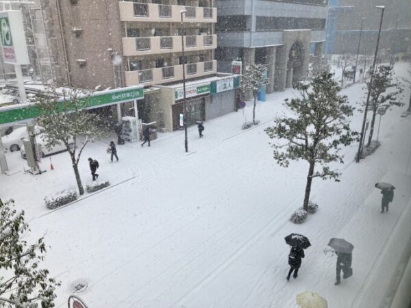 仙台キャンパスからは仙台駅東口近くの様子が見渡せるのですが、雪が降ると駅までの道のりが真っ白になります。