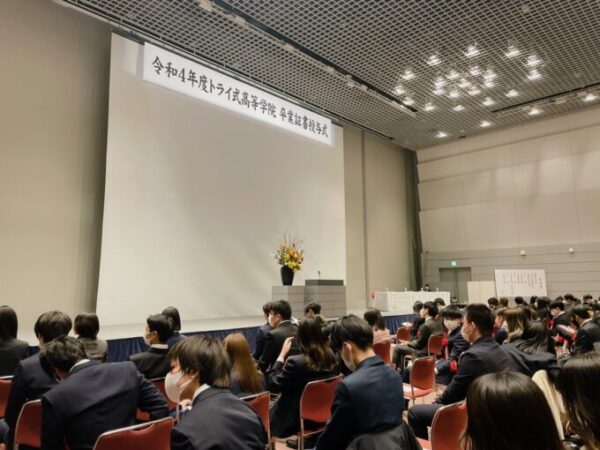 卒業式は、トライ式高等学院 理事の祝辞、連携校の校長先生の祝辞から始まり、卒業証明書の授与、在校生代表による送辞で卒業生にエールが送られました。