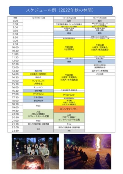 こちらが2022年秋の林間学校のスケジュール例です。