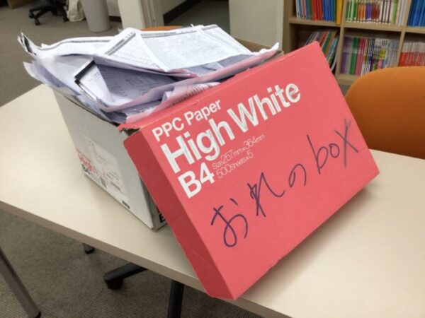 段ボール箱から溢れ出しているのは、受験勉強で使用したプリントやノートです👏