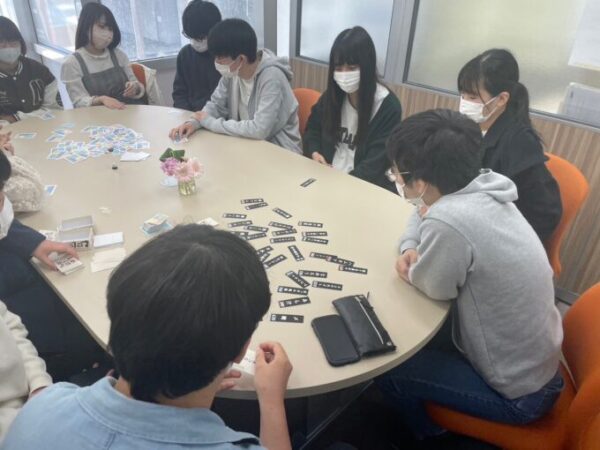 今回やったカードゲームは岐阜キャンパスで大人気の「ITO」と、新しく登場した「れろれろ酒場」というゲームです!レロレロ酒場は居酒屋メニューを「ラ行のみ」を使って言い、札を早い者勝ちで取り合うカルタのようなカードゲームです!「え!?今の何?」とみんなで言いながら楽しく遊ぶことができました~!