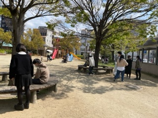 豊橋駅ビル内にあるキャンパスを出発し、駅前の繁華街を抜けその先にある公園まで、丁寧にゴミ拾いをしながら歩いていきます。