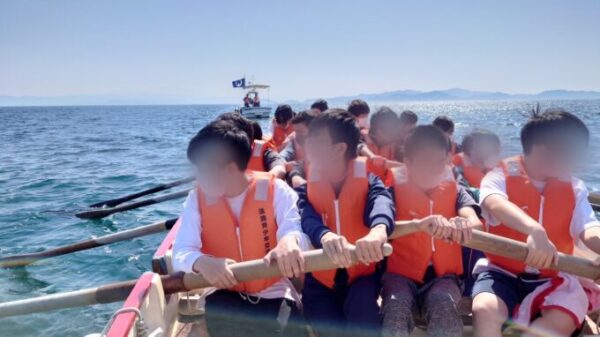 カッターボートを選んだ生徒たちは、仲間と力を合わせて大海原へ漕ぎ出します。重いオールを胸に引き寄せ、前のめりの姿勢に戻ることを繰り返しながら、みんなで協力して前進しました。