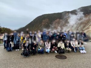 まず初めは大涌谷へ…!奇跡的に雨もやみ、みんなで集合写真を撮ることができました!