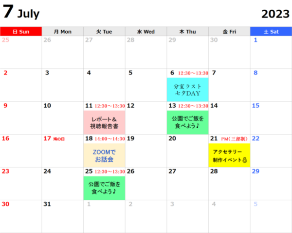 13日(木) 12:30-13:30 近くの公園に出かけてごはんを食べましょう。
