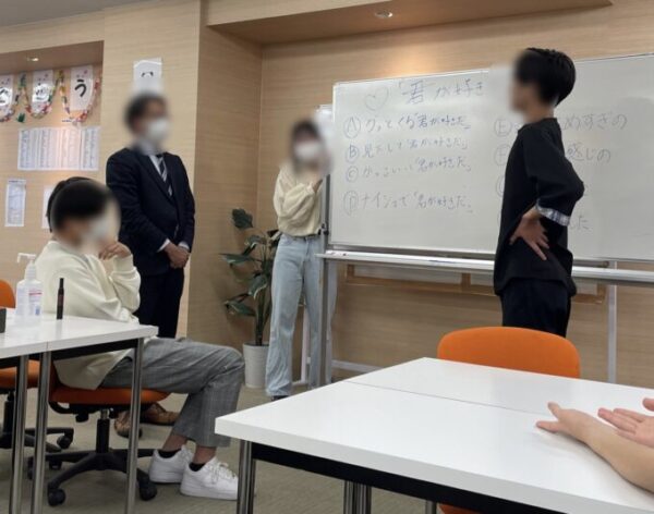 こちらの写真は生徒Mくんがキャンパス長に見下して「君が好きだ」と伝えるシーンです。ドキドキ…