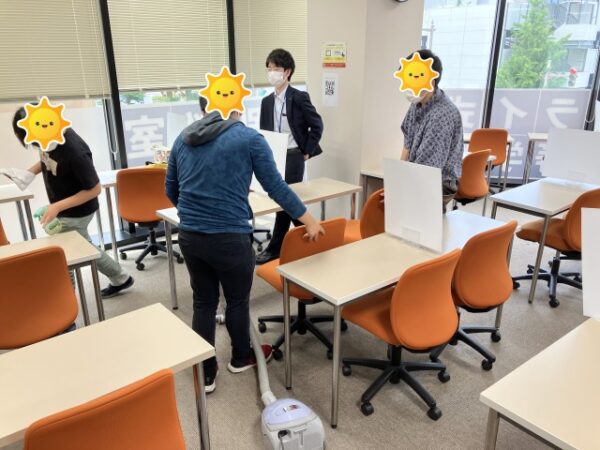 掃除機掛け、机拭き、ごみ捨て、トイレ掃除等々、いろいろありますが、全員でやってくれるのでそんなに時間はかかりません。