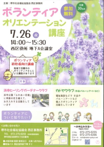 さて、本日は堺市社会福祉協議会西区事務所主催の「ボランティア★オリエンテーション講座🌼」のご案内になります💕