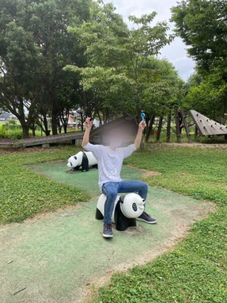 公園の近くにあったパンダの遊具に大興奮なKくん。笑