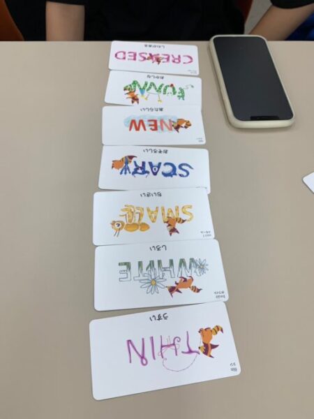 本来なら一人で自分の手持ちのカードで連想できるものを考えるゲームですが、自然とみんなで協力して考えだしました。ちなみにこの日の最高記録はMちゃんの7枚!!
