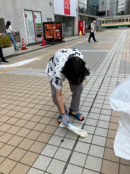今日は予定通りゴミ拾いをしようとCiCビルの外へ出てゴミ拾いを始めてみると、ザーッと雨が降り始めたので、学校周りを中心にゴミ拾いすることにしました。道の真ん中に張り付いているビニール袋や市電の待合場所に空き缶が転がっていたりと普段見ているようで実は目についていないということを発見したと同時に、タバコの吸い殻がところどころに落ちていたことに愕然としました。😢