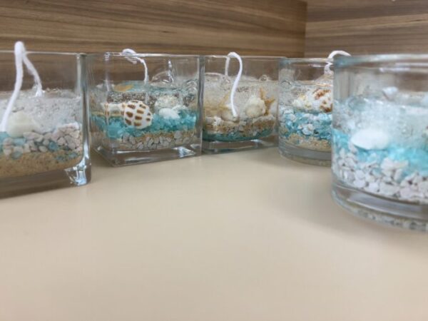 キャンドルの芯を割りばしで固定し、砂や石・貝などを各々好きに飾り付けし、そこにロウを流し込んで作りました。