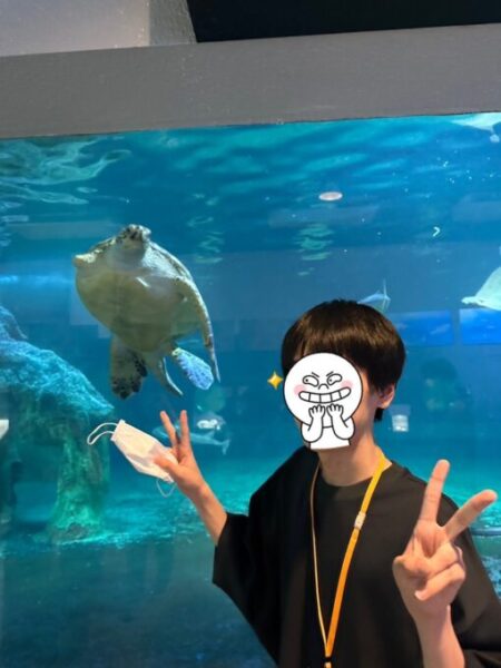 ウミガメと嬉しそうにツーショットを決める彼は