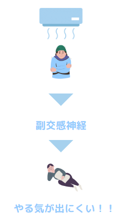 文字通りです。最近、暑い日が続いており、冷房を使用してることも多いかと思います。しかし、冷房によって身体を冷やしすぎると、やる気が出にくくなってくるのです(かといって、暑すぎることが良くないことは明白です)。