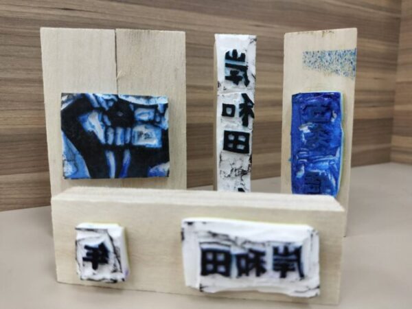 消しゴムに文字を書いたり、絵を描いたりして、その周りを彫刻刀で削っていきました。それから、その消しゴムを木材に貼り付けました。