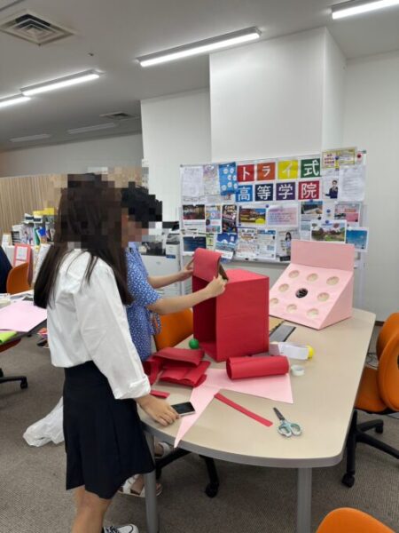 輪投げやボール投げ、千本くじなど夏祭りの準備を着々と進めています!