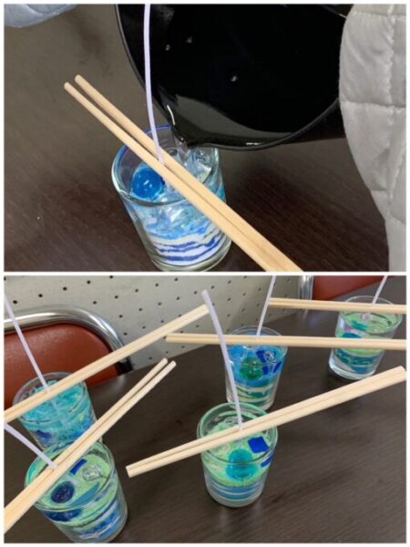 ジェルは溶けやすくするために小さくちぎって小鍋に入れるのですが、今年は2年生のT君をちぎり係に任命笑「これ、気持ちいい~。ずっと触ってたい~。」と楽しそう🎵キャンドル芯を割りばしで固定し、火傷に気を付けながら、そっと熱々のジェルを流し入れます。
