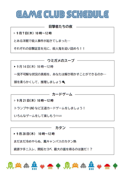 本日は、9月のゲームサークル活動内容のご案内です📃