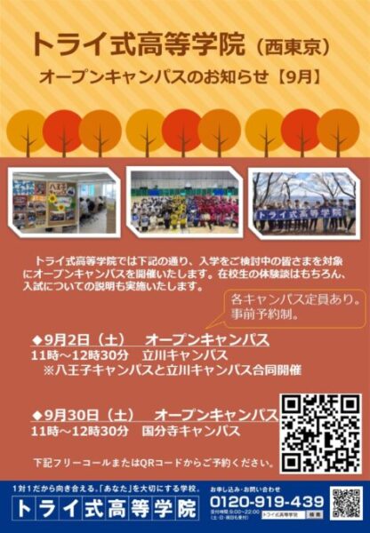 来る9/2(土)11:00~、トライ式高等学院立川キャンパスにて、八王子キャンパスと立川キャンパスの合同オープンキャンパスが開催されます!