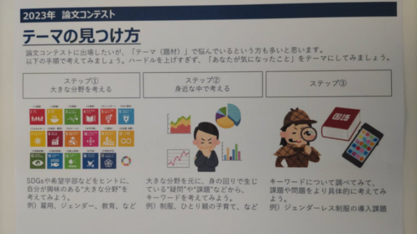 3部門の中から自分の好きな部門を決め、テーマについて1200~2000文字で論文を書きます。
