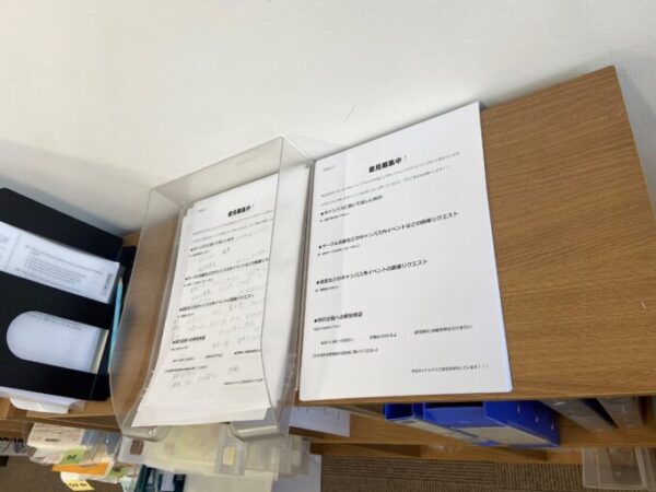 スタッフが居るデスクのすぐ近くに設置してあるので、みなさんぜひ書き書きしてくださいね~!!